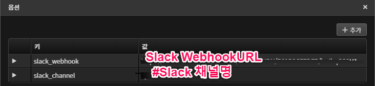 미리 만들어 둔 WebhookURL 및 Slack 채널을 아래와 같이 옵션을 추가해서 넣어 줍니다.