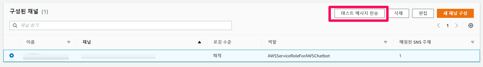 AWS Chatbot에서 구성된 채널을 선택하고 테스트 메시지를 전송해봅니다.