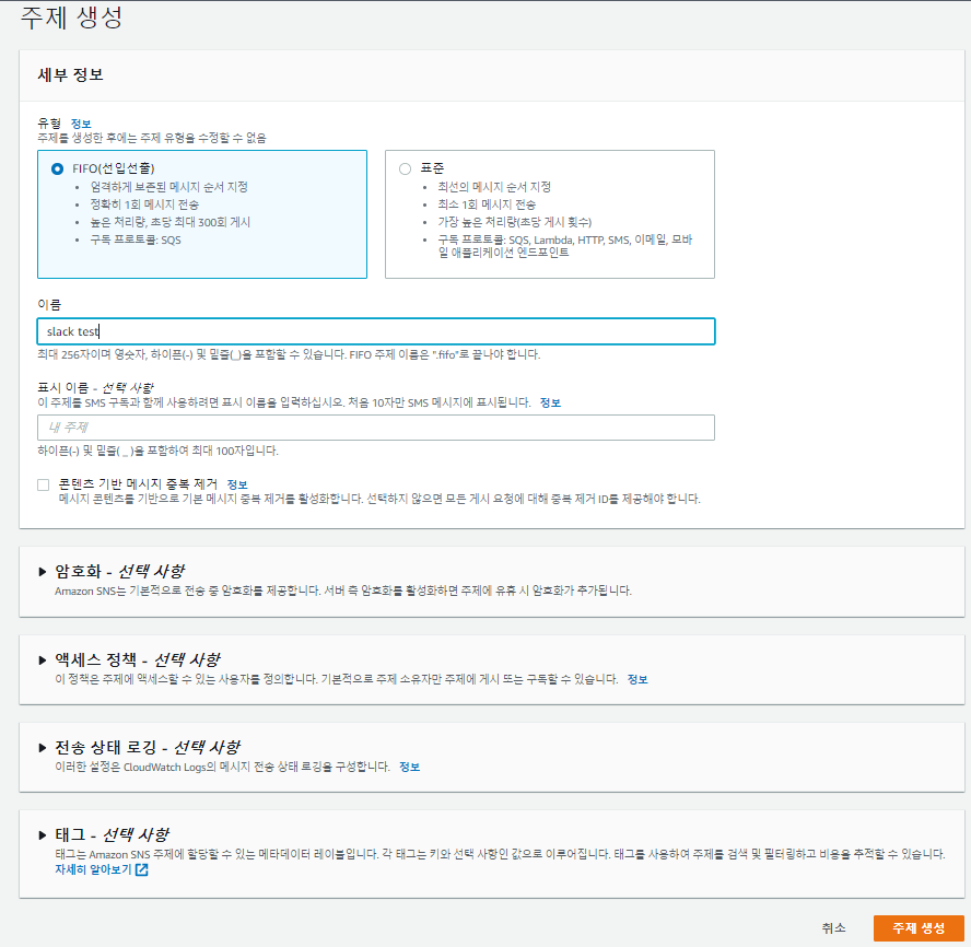 Slack으로 메세지를 전송해주는 SNS 주제를 생성합니다.