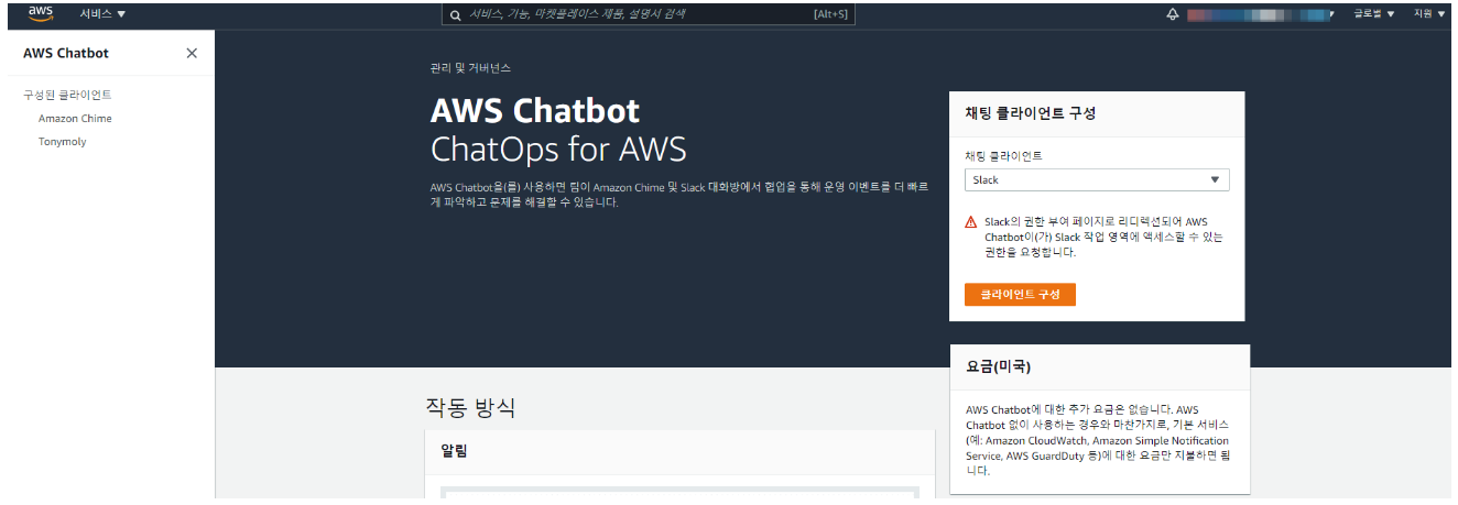 AWS Console에 로그인후 AWS Chatbot서비스로 접속하여 채팅 클라이언트를 Slack로 설정하고 클라이언트를 구성합니다.