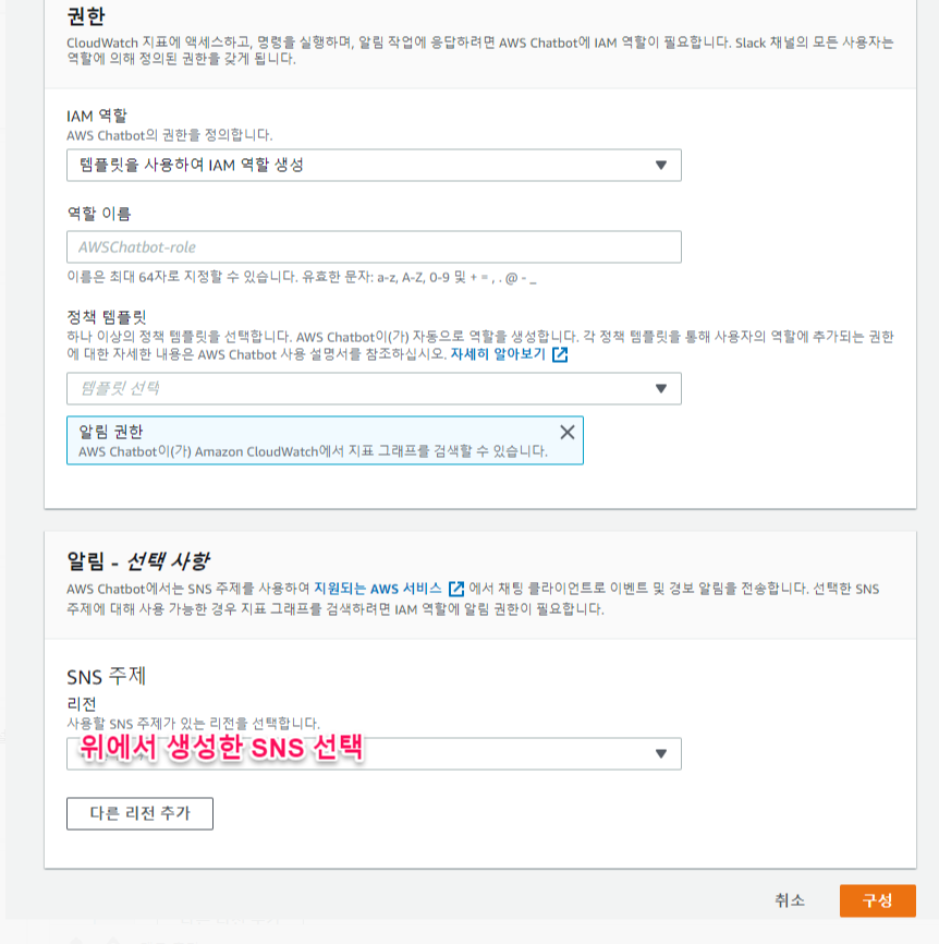 권한은 템플릿을 사용하여 IAM 역할을 생성하고, 위에서 만든 SNS 주제를 선택합니다.
